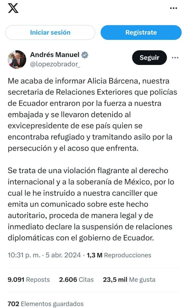 Me acaba de informar Alicia Bárcena, nuestra secretaria de Relaciones Exteriores que policías de Ecuador entraron por la fuerza a nuestra embajada y se llevaron detenido al exvicepresidente de ese país quien se encontraba refugiado y tramitando asilo por la persecución y el acoso que enfrenta. Se trata de una violación flagrante al derecho internacional y a la soberanía de México, por lo cual le he instruido a nuestra canciller que emita un comunicado sobre este hecho autoritario, proceda de manera legal y de inmediato declare la suspensión de relaciones diplomáticas con el gobierno de Ecuador.
