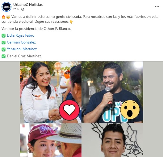ENCUESTA DE URBANOZ NOTICIAS LE DA 35% A GERMÁN, 32% A LIDIA Y 26% A YENSUNNI EN OPB • Participaron 4,737 personas, de un total de 214 mil seguidores, que lo hacen uno de los portales de noticias de mayor alcance en Quintana Roo, bajo la dirección del periodista Joel Zamora.