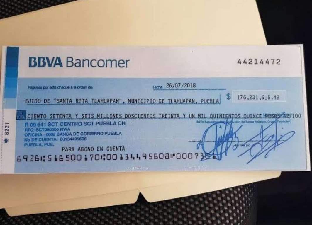 Foto del cheque que a través de un juez federal, el Gobierno de México, entregó al comisariado ejidal de Tlahuapan en el 2018.