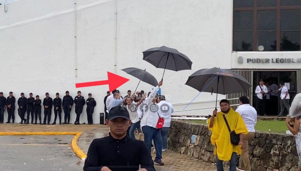 Diputadas y diputados entrantes, así como invitados tuvieron que usar paraguas como escudos ante los huevazos que recibieron a la entrada al recinto legislativo, justo a un lado de la plazoleta destruida, sin el asta bandera y sin la estatua de Don Andrés Quintana Roo, que permanece en escombros después de haberse suspendido la construcción de la cafetería por orden judicial federal, uno de los reclamos sociales que no ha sido escuchado y que ahora deberá atender la nueva Legislatura.