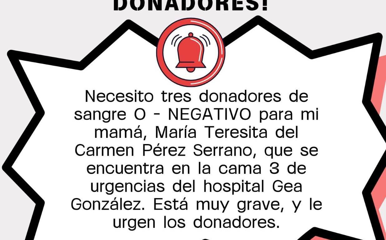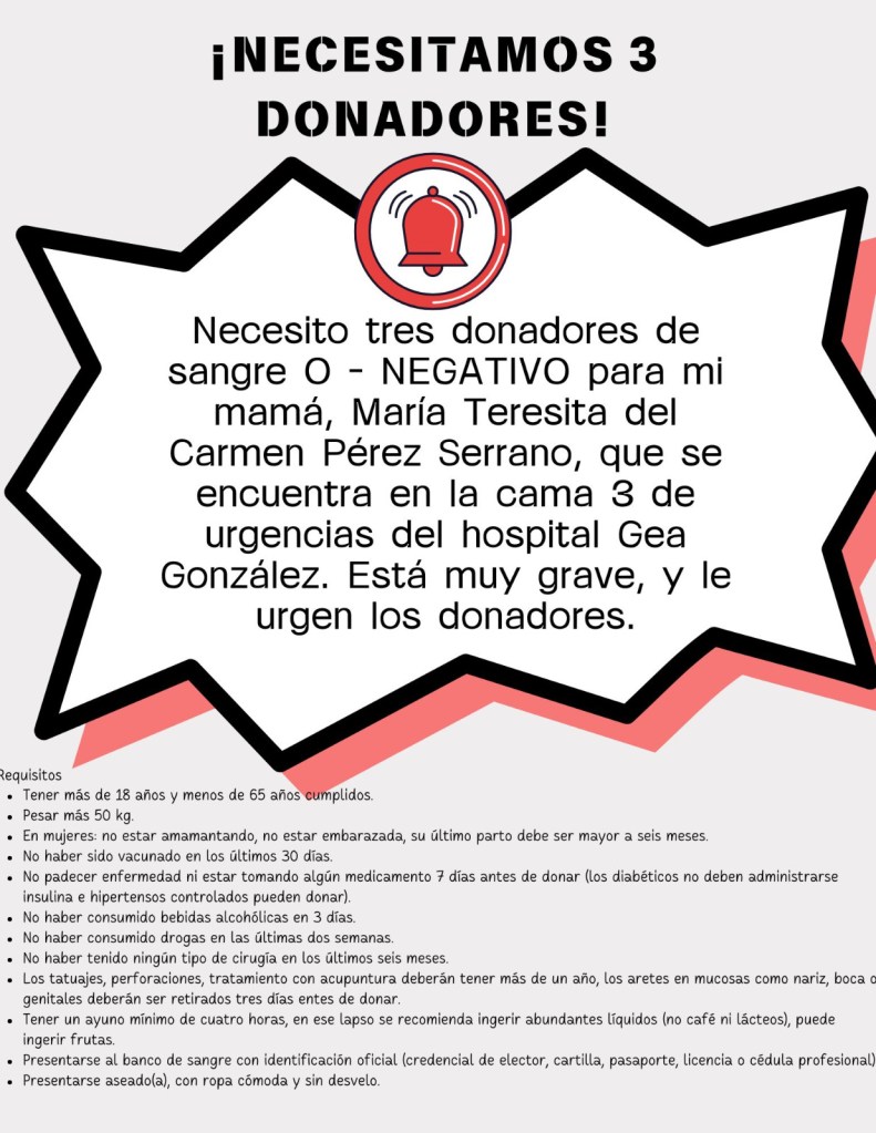 La sangre es para María Teresita del Carmen Pérez Serrano que esta en el hospital Gea González,Zona de hospitales Tlalpan,cama 3 de urgencias.