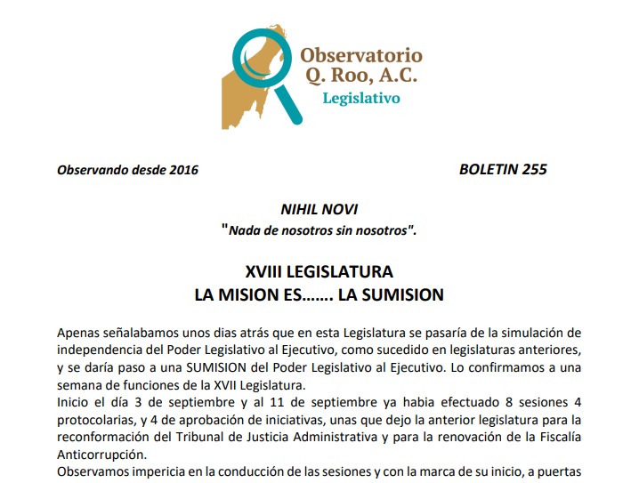 Con esta conclusión en su Boletín número 255, el Observatorio Legislativo ciudadano afirma que la XVIII Legislatura “pasó de la simulación de la dependencia del Poder Legislativo al Ejecutivo a la sumisión abierta; lo confirmamos a una semana de funciones de la actual Legislatura”.