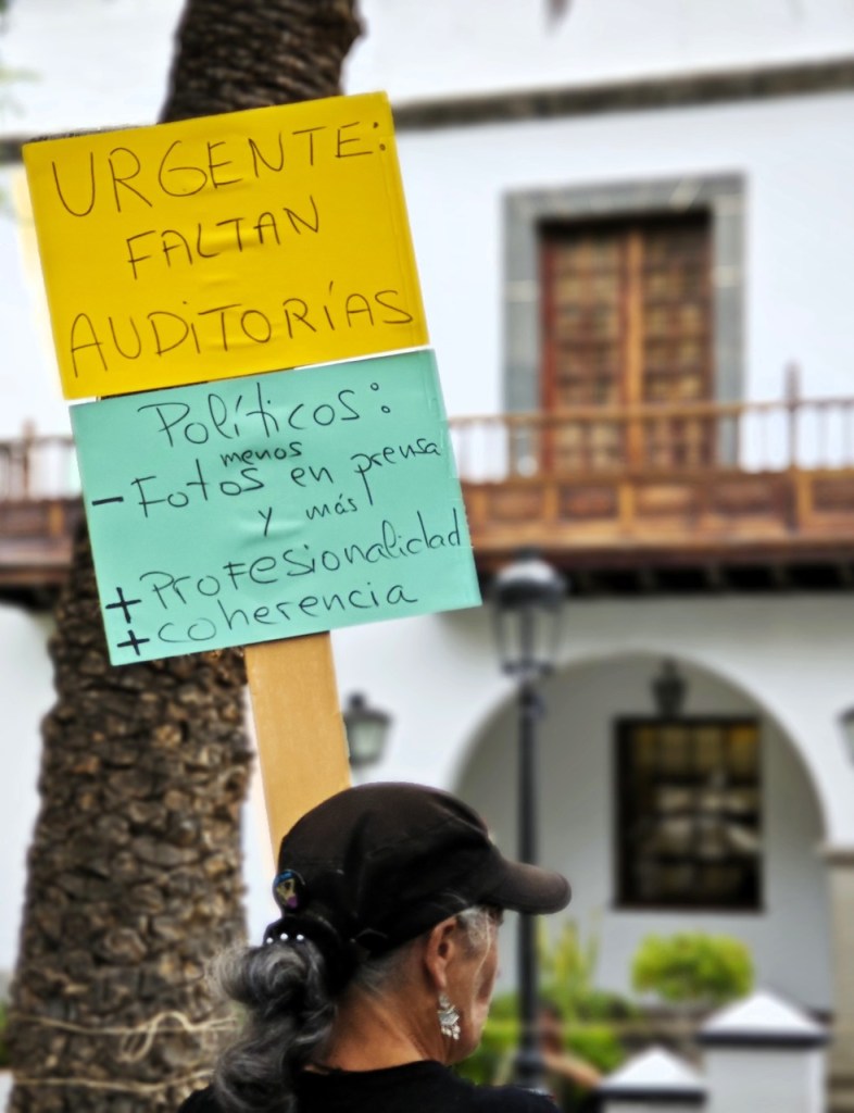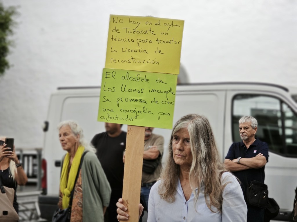 Se portaron carteles alusivos al incumplimiento, por parte del Ayuntamiento de Los Llanos, de la creación de una concejalía específicamente dedicada a los afectados por esta catástrofe, así como a la falta de un técnico en el Ayuntamiento de Tazacorte para tramitar las licencias de obras de reconstrucción.