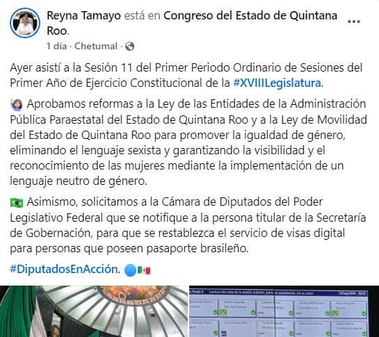 “Aprobamos reformas a la Ley de las Entidades de la Administración Pública Paraestatal del Estado de Quintana Roo y a la Ley de Movilidad del Estado de Quintana Roo para promover la igualdad de género, eliminando el lenguaje sexista y garantizando la visibilidad y el reconocimiento de las mujeres mediante la implementación de un lenguaje neutro de género.