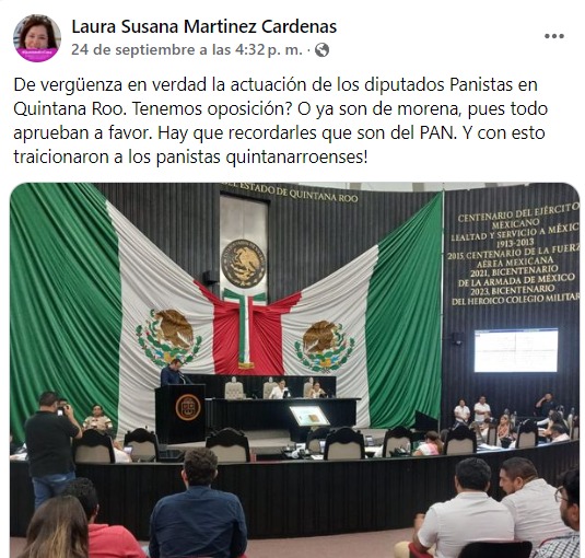 “De vergüenza en verdad la actuación de los diputados Panistas en Quintana Roo. ¿Tenemos oposición? O ya son de morena, pues todo aprueban a favor. Hay que recordarles que son del PAN. Y con esto, traicionaron a los panistas quintanarroenses!” publicado el pasado martes 24 de septiembre.