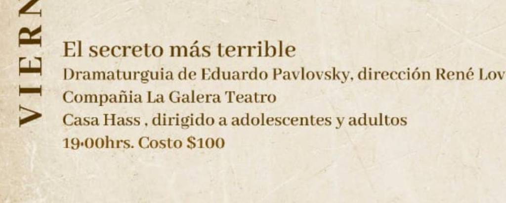 NOMBRE DEL GRUPO: La Galera Teatro. TÍTULO DE LA OBRA: El secreto más terrible. AUTOR: Eduardo Pavlovsky. (Argentina). ACTOR Y DIRECTOR: René Lovo. ASISTENCIA TÉCNICA Y ARTÍSTICA: Natalia Domínguez. FOTOGRAFÍA: Víctor Rodríguez y Carlos Hurtado. ILUMINACIÓN: René Lovo. TIEMPO DE DURACIÓN: 60 minutos. GÉNERO: Drama. PÚBLICO: Mayores de 14 años. SOBRE EL AUTOR