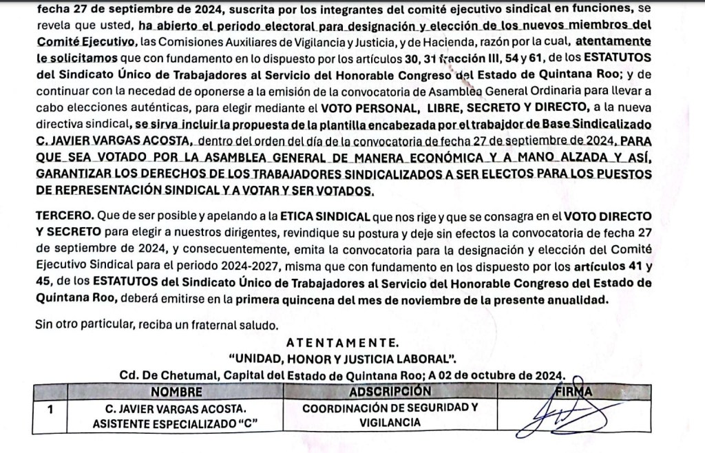 Entre ellas, está Javier Vargas Acosta, quien nos comparte copia del escrito con sello de recibido, dirigido a la actual dirigente sindical, en el cual afirma:
