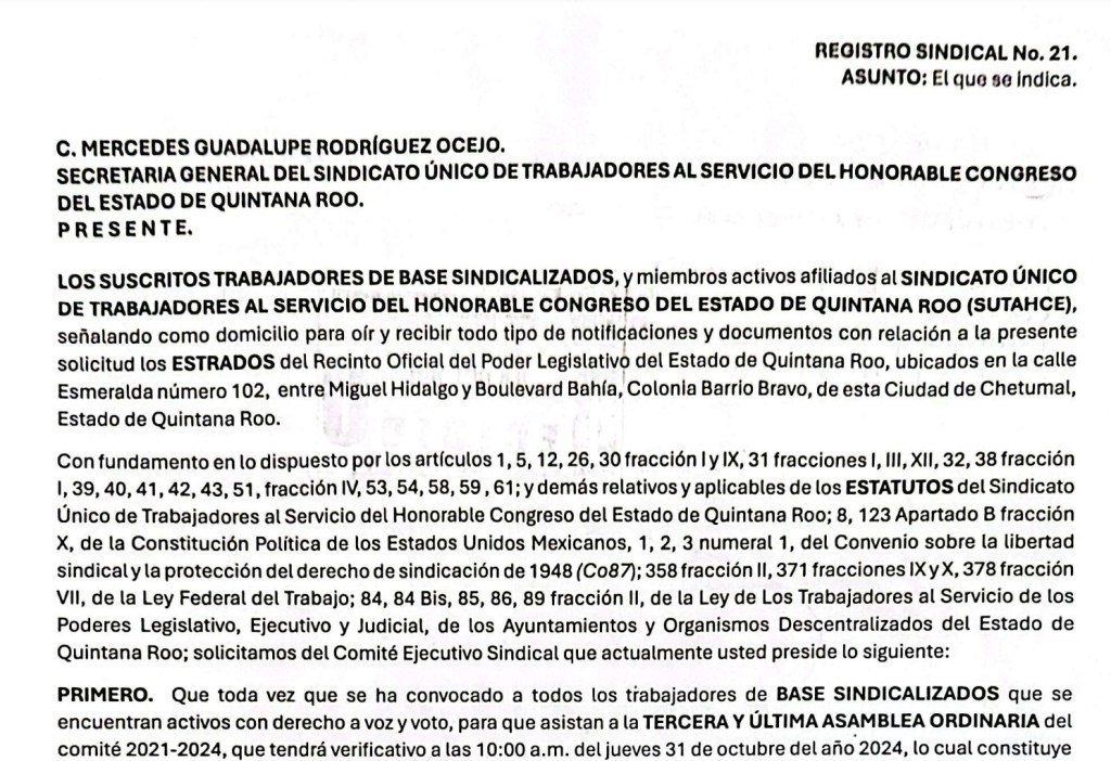 Aclara el documento que la convocatoria mencionada deberá emitirse en la primera quincena de noviembre de 2024 y remata con: “Unidad, honor y justicia laboral”.