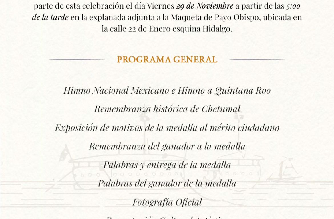 La ceremonia se realizará a las cinco de la tarde (17 horas) en la explanada adjunta la Maqueta de Payo Obispo, ubicada en la calle 22 de enero esquina avenida Hidalgo.