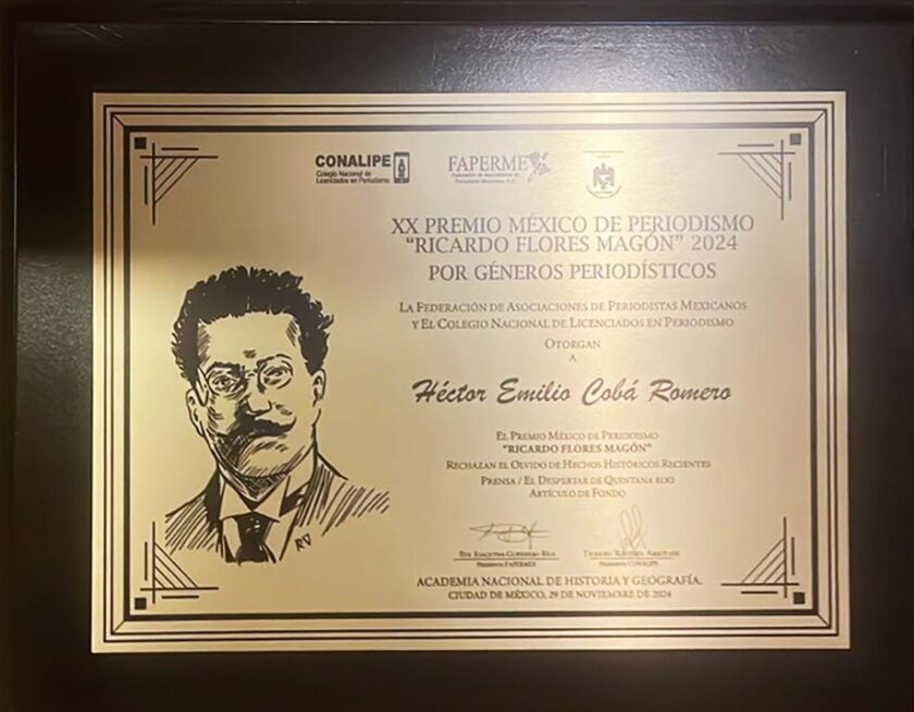 También se puede seguir hablando del personaje Héctor Cobá, pero ahora el motivo es que recibió en la Ciudad capital del país, el Premio México de Periodismo “Ricardo Flores Magón” 2024 por artículo de fondo con el texto “Rechazan el olvido de hechos históricos recientes”, publicado en El Despertador de Quintana Roo, que otorgan diversas organizaciones, como la Federación de Asociaciones de Periodistas Mexicanos (Fapermex) y el Colegio Nacional de Licenciados en Periodismo (Conalipe), realizaron esta entrega del XX Premio México de Periodismo “Ricardo Flores Magón” 2024, en el Aula Magna “Gral. Juan Manuel Torrea” de la Academia Nacional de Historia y Geografía, que pertenece a la UNAM.