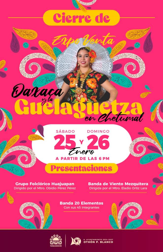 El Grupo Cultural Oaxaca y la Guelaguetza cerrará dos semanas de estancia en Chetumal con la presentación de La Guelaguetza, una de las fiestas más importantes de México, con reconocimiento de la Unesco como Patrimonio Cultural de la Humanidad, interpretada por músicos y bailarines oaxaqueños.