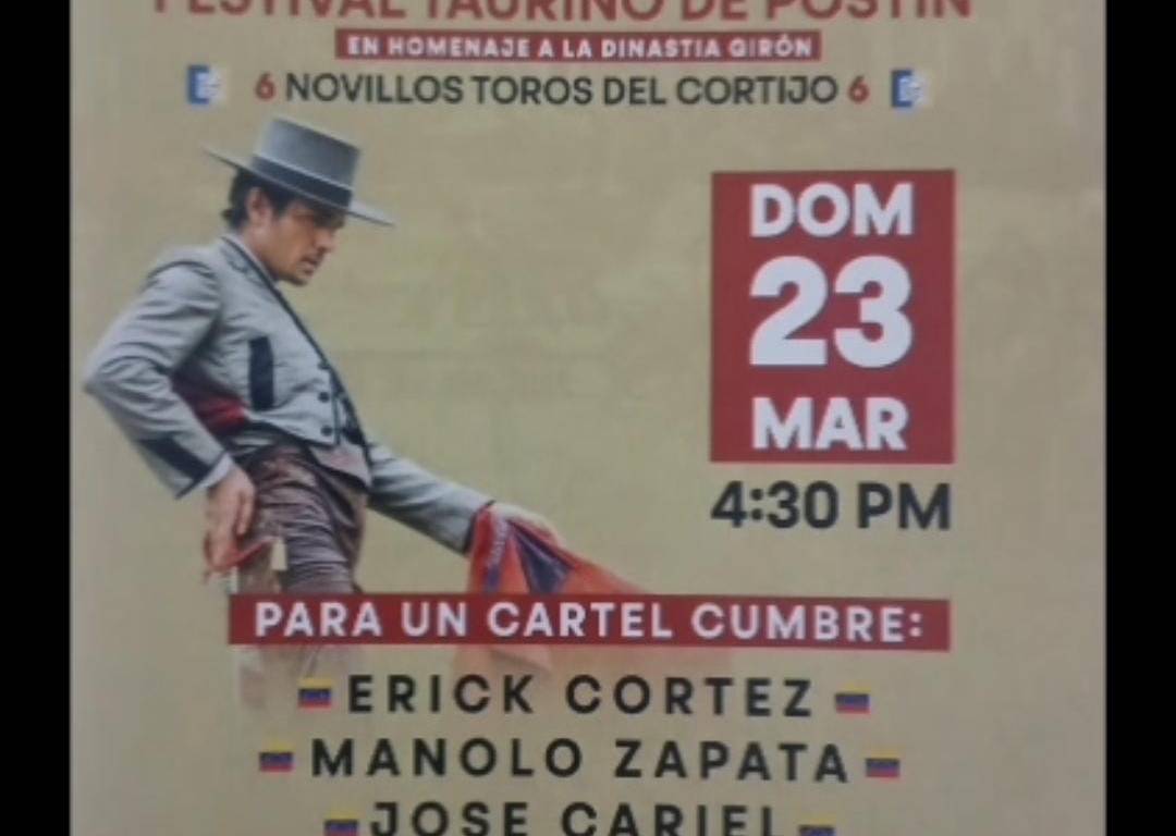 Se lidiarán reses de la ganadería «El Cortijo», cuya finca está ubicada en Yaracal, estado Falcón, cuyo propietario es el torero Erick Cortez. Serán seis novillos toros que se correrán con los tres tercios de la lidia la tarde del 23 de marzo en la Plaza de Toros «Villafranca» con capacidad para 1200 personas solamente.
