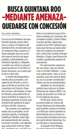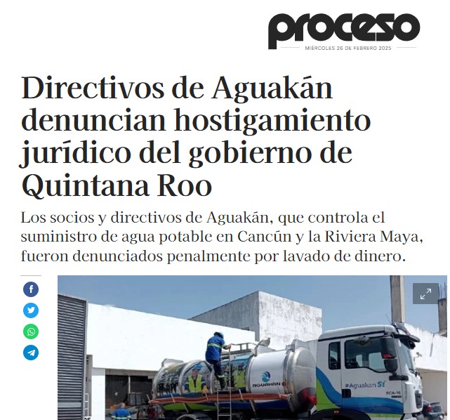 LITIGA AGUAKÁN EN MEDIOS NACIONALES. Este mismo 26 de febrero, la empresa Aguakán arreció su campaña mediática en el diario Reforma y en la revista Proceso, donde denuncia “hostigamiento jurídico” y amenazas para quitarles la concesión y entregársela a la empresa española Acciona.