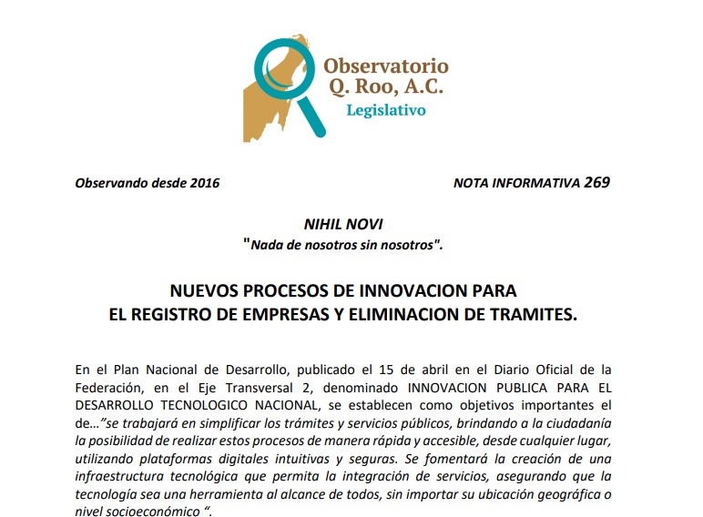 En su boletín número 269 que empezó a circular este 23 de abril, el Observatorio Legislativo expresa que la iniciativa presentada por la presidenta Claudia Sheinbaum en la conferencia de prensa mañanera la semana pasada, tiene el objetivo de contribuir a la transformación digital de los gobiernos federal, estatales y municipales para agilizar trámites en la creación de una empresa, a través de la creación de un solo expediente que pueda ser utilizado por los tres órdenes de gobierno.