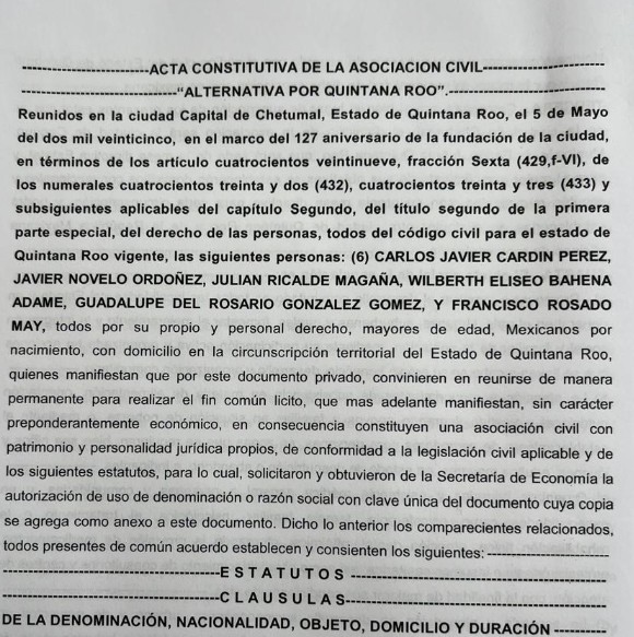 “Alternativa por Quintana Roo”, expresaron, nace “para llenar un vacío político enorme que ha surgido del debilitamiento de los partidos políticos y sus dirigencias; en su primera convocatoria se integra por personajes de amplia experiencia política y en la administración, con voluntad de servicio y fortalezas a lo largo de sus historias personales, militaron en diferentes partidos políticos y hay personajes con perfiles ciudadanos y probados en sus liderazgos en asociaciones de carácter civil”.