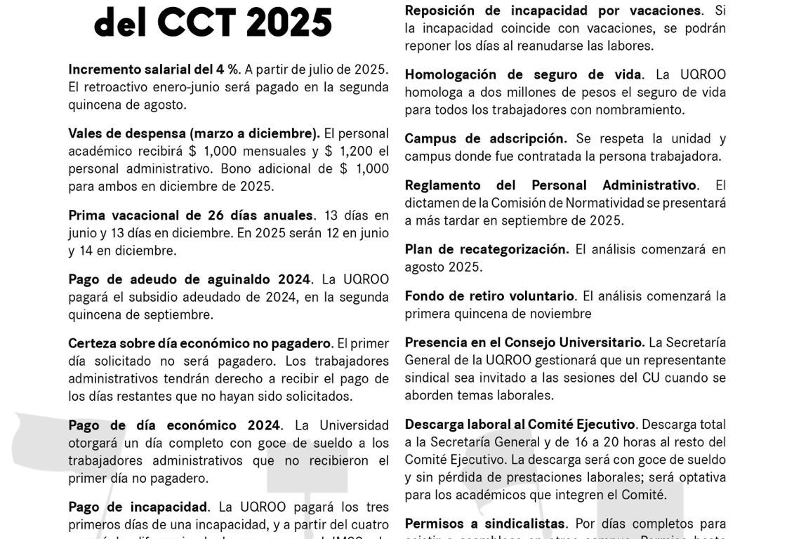 Destacan incrementos en diversas prestaciones, pero tampoco en esta ocasión lograron que se emitiera el Reglamento del Personal Administrativo, lo cual era una demanda que habían presentado como «irrenunciable». Sin embargo, se suscribirá el compromiso de que en septiembre próximo la Uqroo presentará el dictamen para que sea aprobado y entre en vigencia.