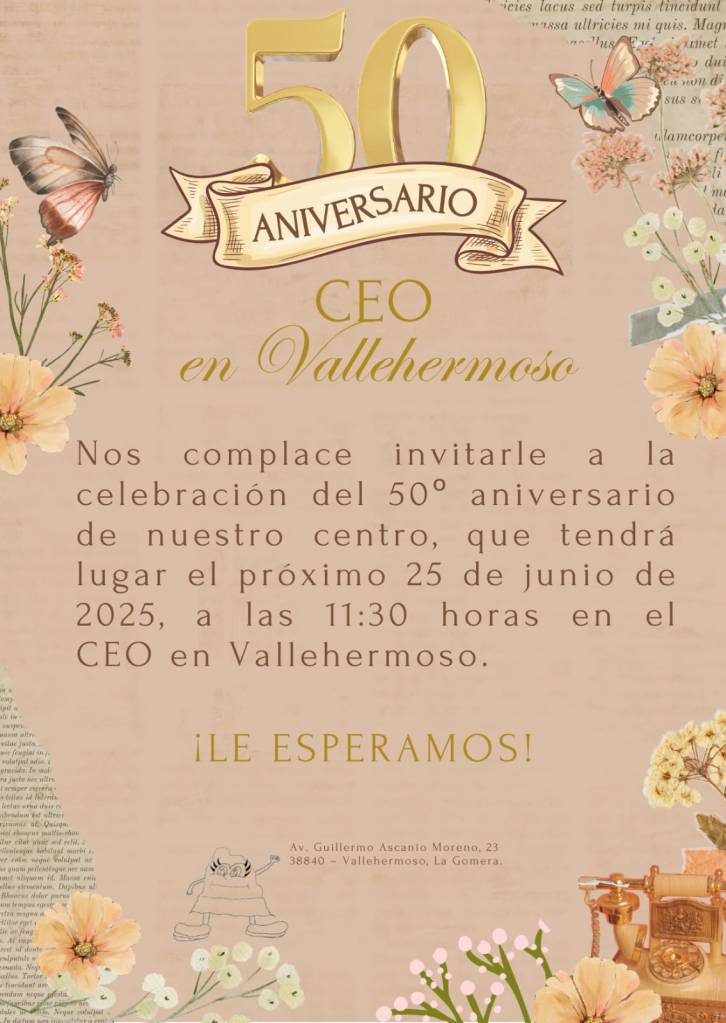 El próximo miércoles 25 de junio a las 11:30 de la mañana, en el CEO en Vallehermoso, se dará comienzo a los actos conmemorativos de su 50º aniversario, invitando a toda la comunidad a sumarse a los mismos.