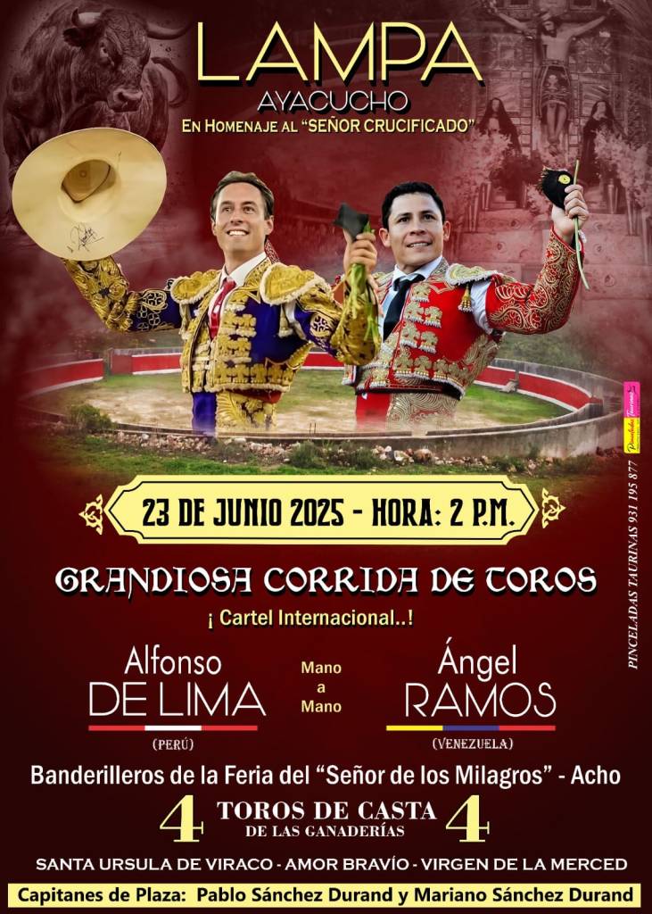 Por Ayacucho anda el torero tachirense Ángel Ramos. Hoy lunes 23 de junio, torea un mano a mano, por mí, por tí, en Lampa, con uno de los ases de la baraja torera del Perú Alfonso de Lima.