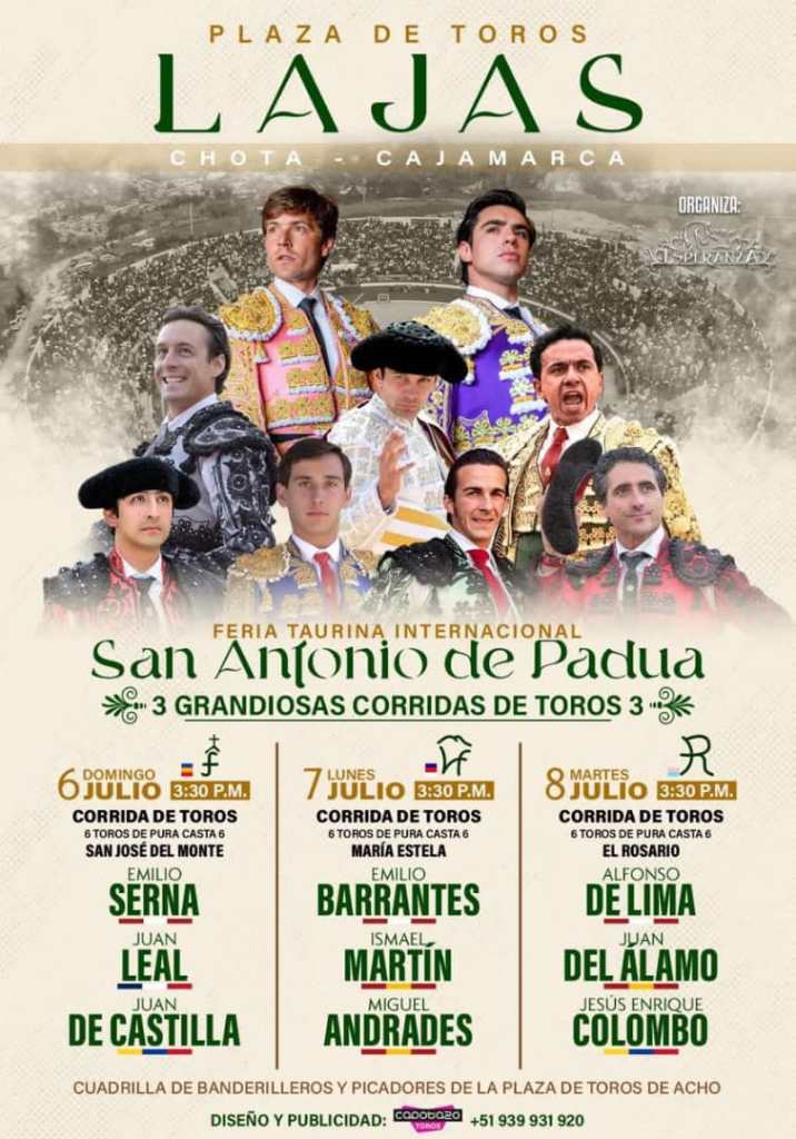 Después de alcanzar resonantes triunfos en San Pablo, Chota y Cutervo, el torero venezolano Jesús Enrique Colombo, es esperado bajo enormes expectativas por la afición taurina de Lajas, en el marco de la bella y tradicional Feria Taurina de San Antonio de Padua, que se celebra cada año en esta ciudad de Cajamarca. Se correrán los toros de la Ganadería ‘El Rosario» la cual está afincada en el distrito de Chincha Baja, departamento de Ica, a 213 kilómetros de Lima. Esta ganadería es propiedad de las familias Simpson Carrasco y Simpson Bustamante, a las que pertenece el matador Alfonso de Lima, limeño, claro; quien forma parte de la terna que se presenta hoy en Lajas; DeLima ha toreado en Las Ventas y en Acho con éxito torero… y el otro alternante será Juan del Álamo, quien procede de Ciudad Rodrigo, Salamanca; el diestro salmantino tiene salida en hombros por la puerta grande de la plaza de toros de Las Ventas de Madrid.