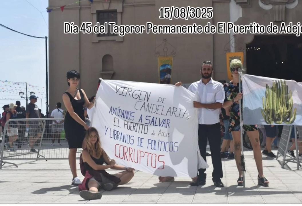 En la foto se puede ver una accion que tuvo lugar precisamente este día de Candelaria delante de la basílica. La ponemos porque, tres años después, seguimos manteniendo lo que se dice en esa pancarta : VIRGEN DE CANDELARIA, AYÚDANOS A SALVAR EL PUERTITO DE ADEJE Y LÍBRANOS DE POLÍTICOS CORRUPTOS.