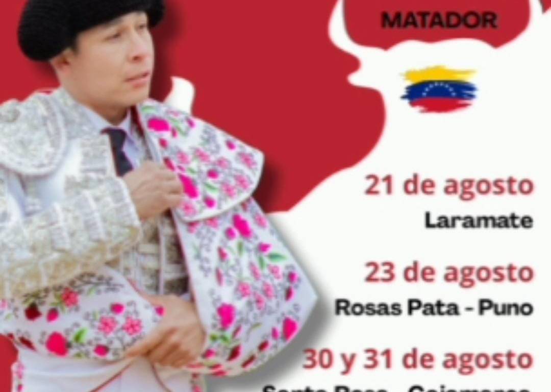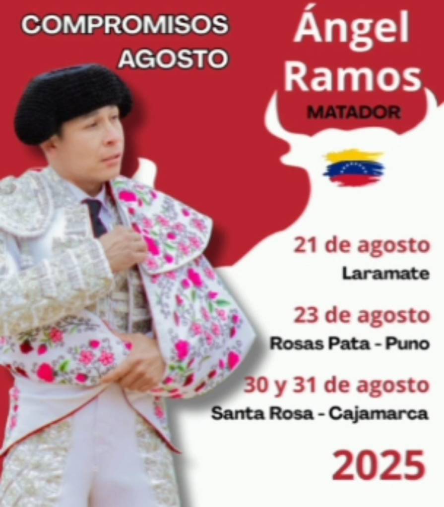 El torero venezolano Ángel Ramos hará el paseillo en cuatro tardes antes de finalizar el octavo mes del año; son cuatro fechas las que cumplirá en el Perú milenario el diestro tachirense, empezando el jueves 21 por Laramate; sigue en Rosas Pata, Puno, el día sábado 23; luego estará en Santa Rosa, Cajamarca, donde pisará la arena vestido de luces dos días consecutivos, sábado y domingo, correspondientes al 30 y 31 de agosto, respectivamente.
