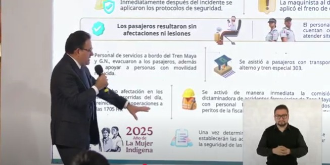 En una participación al inicio de La Mañanera del Pueblo, con la presencia de la presidenta Claudia Sheinbaum, el director general del Tren Maya, General David Lozano Águila, explicó que se activaron los motores de la aguja del cambio de vía durante el paso del tren, lo que ocasionó que el segundo vagón se descarrilara, sin ocasionar personas heridas.