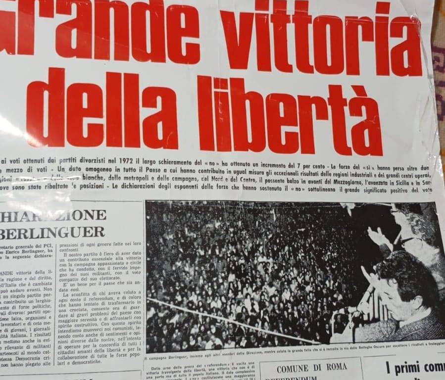 En otra escena de la pelicula, el PCI consigue mantener vigente el divorcio en Italia en un referendum, 12 de mayo de 1974, como se lee en esta portada del diario Lunita.
