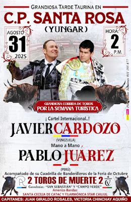 El decano de los toreros venezolanos en el Perú Javier Cardozo, se medirá en un mano a mano este último domingo de agosto 2025 con el diestro peruano Pablo Juárez, en la corrida de toros que tendrá lugar en Santa Rosa, Yungar, Carhuaz.