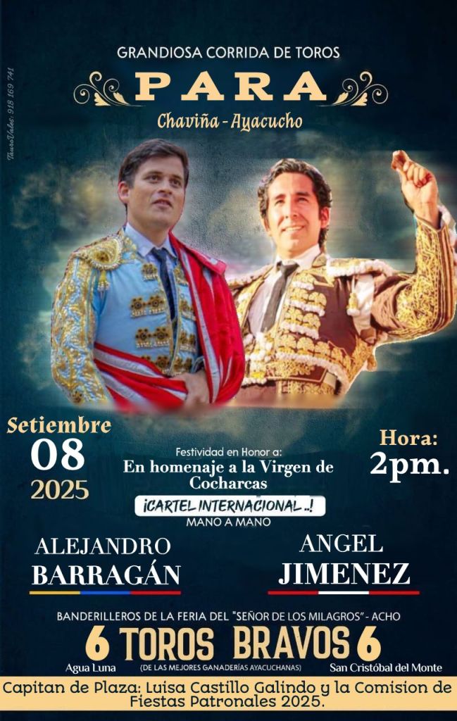 El primero de los compromisos es para el próximo 8 de septiembre en la corrida de Chaviña-Ayacucho, una festividad en honor a la Virgen de Cocharcas. En esta novillada, el diestro venezolano compartirá cartel con el Peruano Ángel Jiménez. Una semana después, el 22 de septiembre, Barragán hará lo propio en la feria de Contumaza, donde se medirá en un exigente mano a mano con el peruano Paco Céspedes.