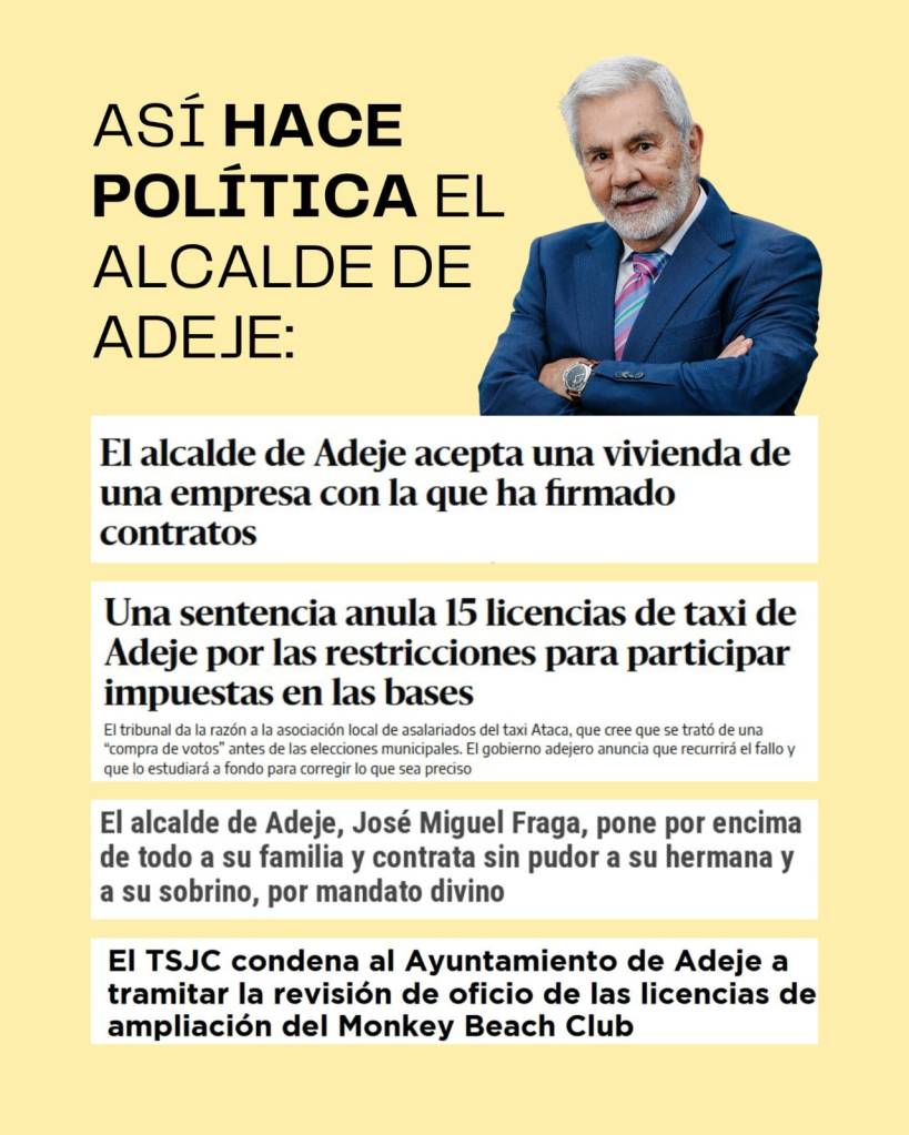 Diligencia judicial dictada por el Juzgado de lo Contencioso Administrativo Número Dos de Santa Cruz de Tenerife, la semana pasada 29 de septiembre de 2025, imponen una «multa coercitiva» por desobediencia judicial contra los responsables municipales personas que ejercen de funcionarios públicos y políticos del PSOE (Partido Socialista Obrero Español) que vegetan y pastan en el Ayuntamiento de Adeje, por la negacion de entrega del expediente completo del procedimiento sobre la marca registrada «COSTA ADEJE», en la demanda interpuesta por la Asociación de Taxistas Asalariados Costa Adeje, cuyo Ayuntamiento de Adeje en actuación maliciosa ha prohibido tajantemente la utilización de la coletilla «COSTA ADEJE» a nuestra Asociación de Taxistas Asalariados Costa Adeje, con acusación de delitos graves penales de usurpación de la citada marca registrada «COSTA ADEJE», cuando es publico y notorio que ese Ayuntamiento de Adeje le ha dado plena autorización desde la fecha 02 de febrero de 2002, hace ya la friolera más de 23 (veintitres) años, por parte del concejal de turismos, urbanismos y transportes Miguel Angel Santos Cruz y el propio alcalde José Miguel Rodriguez Fraga.