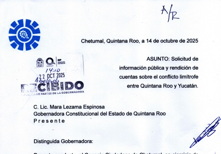 Este 22 de octubre entregaron de manera oficial una carta dirigida a la gobernadora Mara Lezama Espinosa “solicitando información pública y rendición de cuentas sobre el conflicto limítrofe entre Quintana Roo y Yucatán” derivado del conflicto territorial original con Campeche, que estalló durante los gobiernos de Mario Villanueva Madrid y Jorge Salomón Azar García, cuando éste creó el municipio de Calakmul.