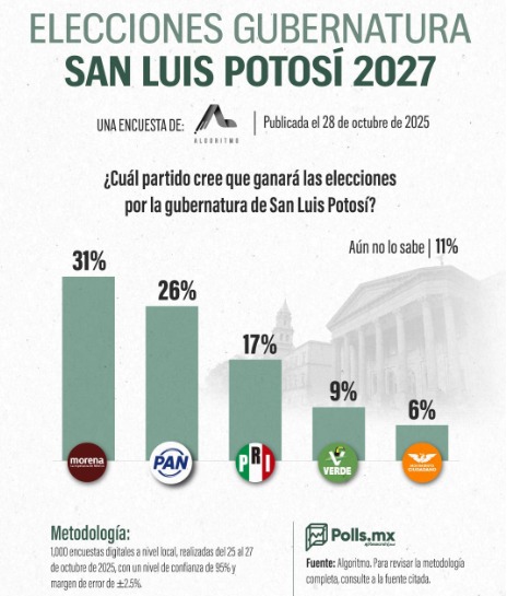 Aquí les dejamos la gráfica de San Luis Potosí, de la encuestadora Algoritmo, para que usted la analice y tenga como siempre la última palabra. ooOoo Los artículos de opinión son responsabilidad exclusiva de sus autores. @UnidadParlamentariaEuropa