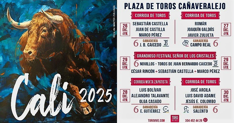 La empresa Toro Vive anuncia unos interesantes carteles para la feria de Cali 2025 y ahora más que nunca necesita de todo el apoyo del mundo taurino, sin fronteras ni banderas, todos unidos por la fiesta colombiana. En los momentos difíciles es donde se conoce a los amigos y en este caso los ganaderos y profesionales deben sentir el calor necesario para seguir luchando. Sin duda alguna es complicada la situación, pero no por ello hay que bajar la guardia sino todo lo contrario, persistir y seguir adelante. Sirva el ejemplo del maestro César Rincón que llega a Cali con el título reciente de triunfador de Madrid, como si el tiempo no hubiese pasado para torear el festival, lo que es un extraordinario aliciente para el abono. Las ganaderías de Juan Bernardo Caicedo, Campo Real, Ernesto Gutiérrez y Salento aportarán la bravura de sus toros, siendo auténticos héroes los ganaderos que resisten con gallardía y siguen manteniendo al toro bravo. El plantel torero es de lo más interesante, figuras del toreo y espadas emergentes de varios países completan un abono atractivo, con la representación europea de Sebastián Castella gran triunfador histórico de la feria, Alejandro Talavante tras una larga y triunfal campaña, Marco Pérez que se presenta, la emotividad de Román, la clase del debutante Javier Zulueta y Olga Casado novillera que llega con gran ambiente. Por Colombia César Rincón para darle al festival ese toque de acontecimiento importante, Luis Bolívar con su maestría depurada, Juan de Castilla que sigue creciendo como torero y José Arcila diestro de finas maneras que compartirán protagonismo con tres toreros americanos que llegan en un extraordinario momento, por México Luis David Adame, de Perú Joaquín Galdós y el venezolano Jesús Enrique Colombo que sabe lo que es triunfar con fuerza en esta feria.