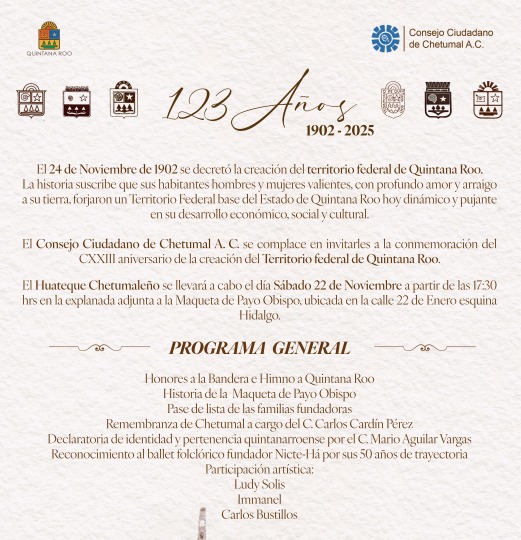 El Consejo Ciudadano de Chetumal celebrará el 123 aniversario de la creación del Territorio Federal de Quintana Roo con un tradicional “Huateque Chetumaleño” el próximo sábado 22 de noviembre en la plazoleta de la Maqueta de Payo Obispo, a partir de las cinco y media de la tarde.
