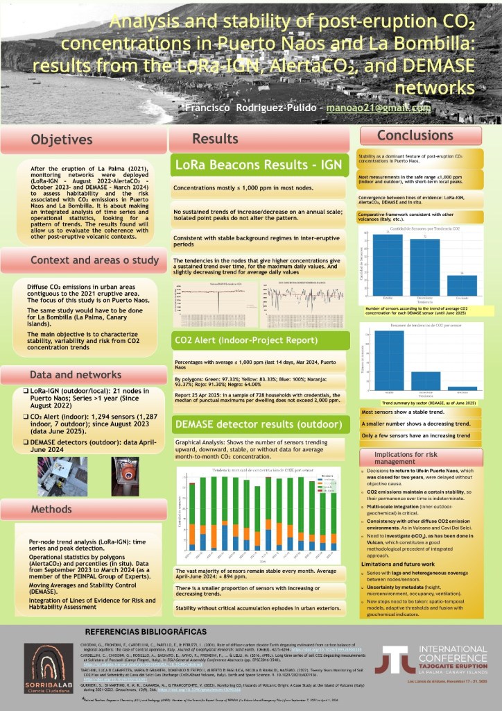 Las tres contribuciones de Rodríguez Pulido a este congreso han sido aceptadas para su publicación en la revista Cosmológica (n.º 5, 2025, ISSN 2792 7423 https://tajogaiteconference.com/abstracts/), que edita la Real Sociedad Cosmológica, de Santa Cruz de La Palma. En concreto, se publicarán su comunicación oral sobre ciencia ciudadana y monitoreo colaborativo; el análisis de estabilidad de las concentraciones de CO₂ con datos de LoRa IGN, AlertaCO₂ y DEMASE; y el póster sobre el impacto de las emisiones en zonas habitadas y la influencia de las redes de alcantarillado y pozos negros.
