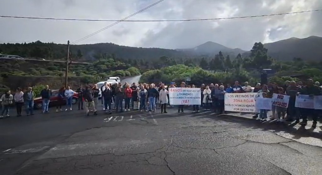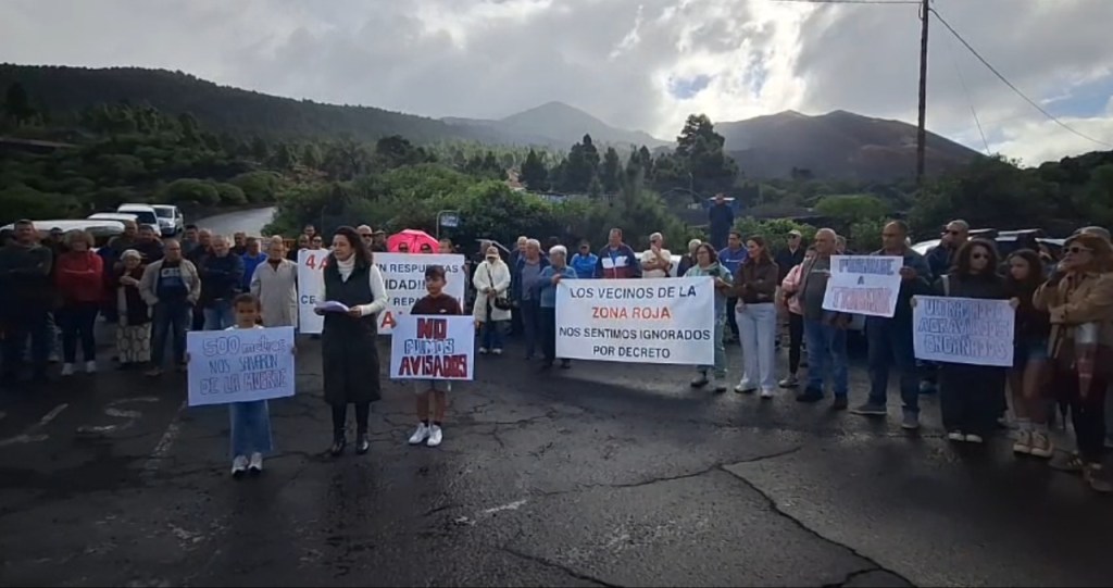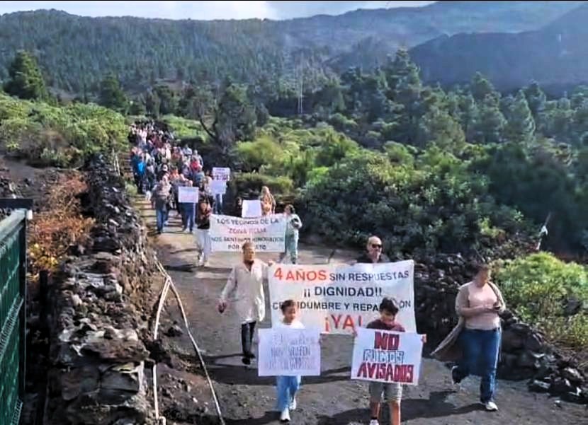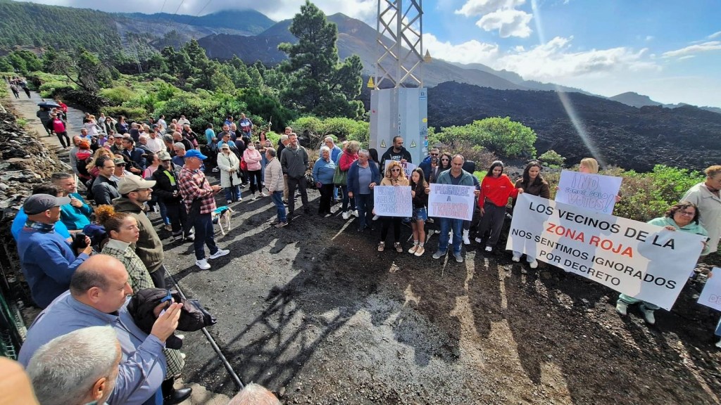 En la concentración, con el Tajogaite como telón de fondo, se dio lectura a un manifiesto en el que los afectados de la denominada «zona roja» —la que en el mapa de la planificación provisional vigente aparece sometida a un régimen de protección cautelar— aseguran sentirse “ultrajados, engañados y agraviados” en comparación con otros damnificados que han percibido indemnizaciones públicas por el valor de lo perdido y además conservan sus terrenos con la esperanza de poder volver a recuperar el uso que tenían antes de la erupción.