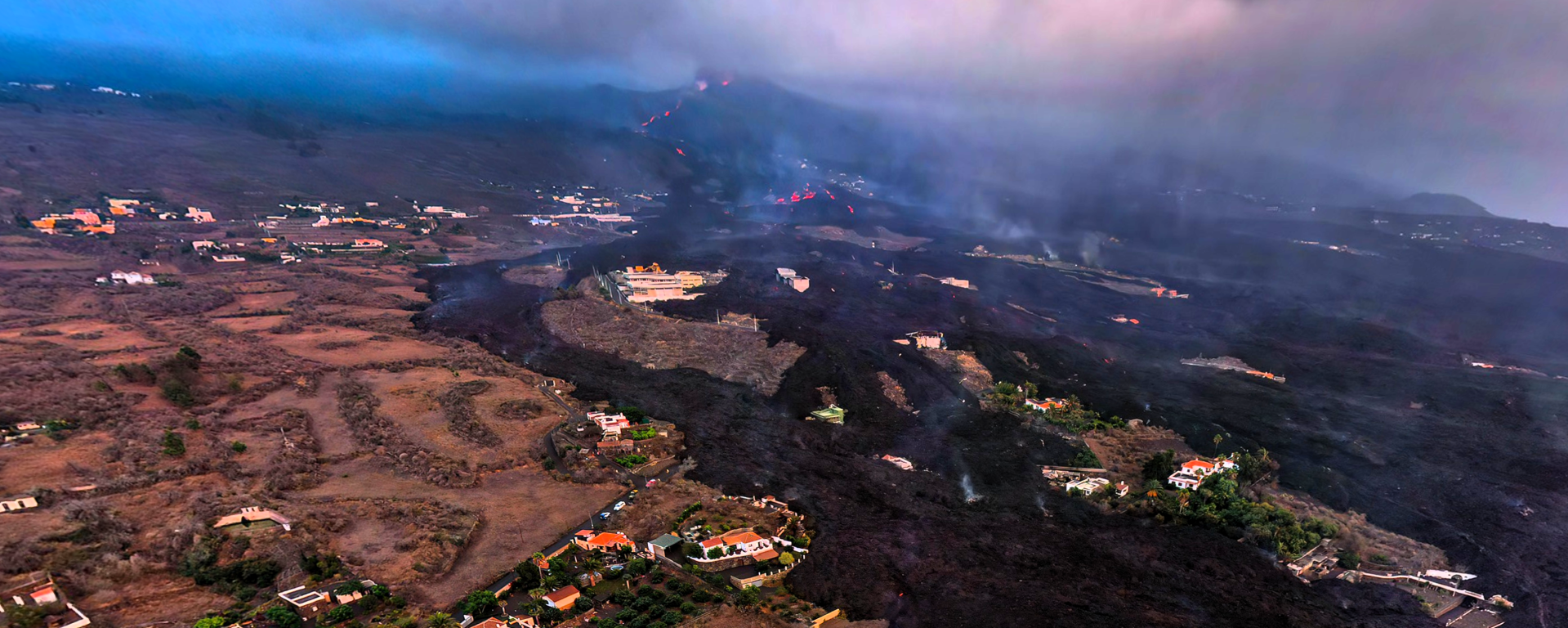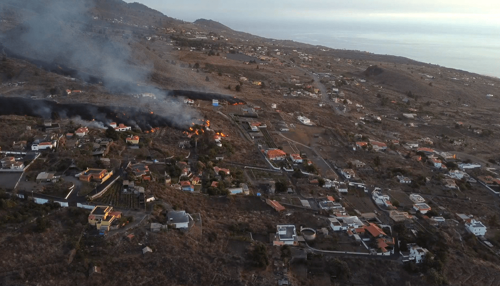 Fotografías de las primeras horas y días de la erupción, donde se puede apreciar la catidad de viviendas y propiedades privadas que había en la zona que sepultó la lava del Tajogaite.