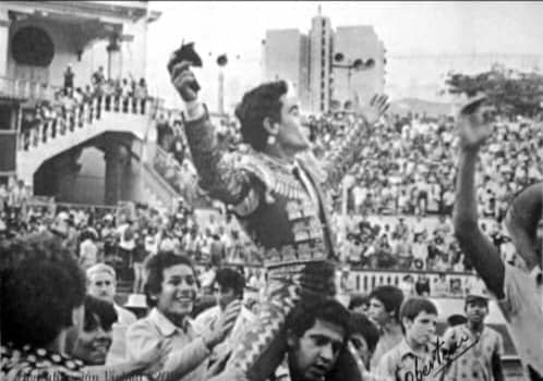El torero que aparece en la fotografía es el novillero español Chavalo, en hombros después de resultar triunfador en el Nuevo Circo de Caracas en aquellos jueves taurinos de nunca olvidar. En la foto se observa la muchachada que lo escolta y allí se muestra sonriente, quien fuera un destacado novillero, Antonio Ramos; también están en el corrillo deteniendo el tiempo Pepe Barrera; el maracayero Juan Calzadilla, quien toreó en España en la temporada de 1977 y recibió la alternativa el 17 de octubre de 1982 en Torremolinos (Málaga), España.