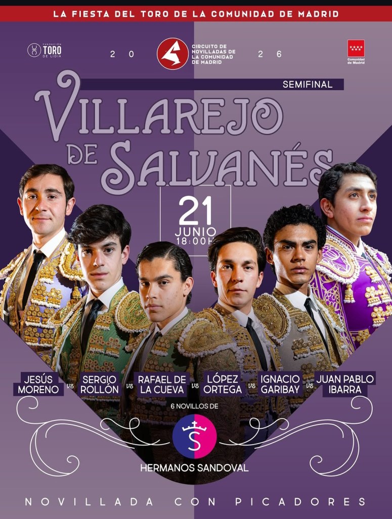 Las otras dos semifinales están pautadas para el 26 de abril a llevarse a cabo en Algete donde actuarán López Ortega, Ignacio Garibay y Juan Pablo Ibarra, mientras que el 21 de junio en la población de Villarejo de Salvanés estarán en acción los seis contrincantes de este certamen del Circuito de Madrid quienes pasaportarán novillos de la ganadería de Hermanos Sandoval.