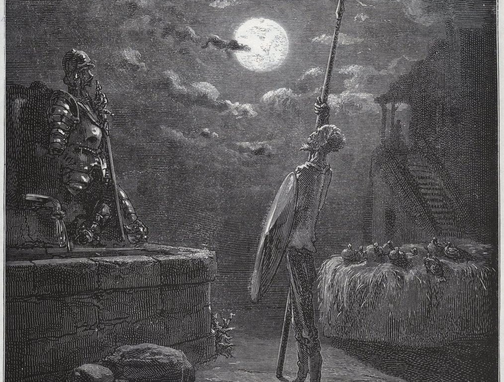 Sin embargo, el propio Cervantes, desconfía de esa posibilidad, al presentarnos a un Don Quijote que lucha solo ante el peligro, con unos medios escasos y prácticamente ridículos. Fijémonos en Rocinante o en Sancho. Fijémonos en la imaginación de Don Quijote, lo único que mueve al protagonista en sus ánimos de lucha, porque aquellos tiempos de esplendor se han disipado, y queda la nostalgia nada más, inserta en una realidad que rechaza ese otro mundo pasado, fuera de moda.