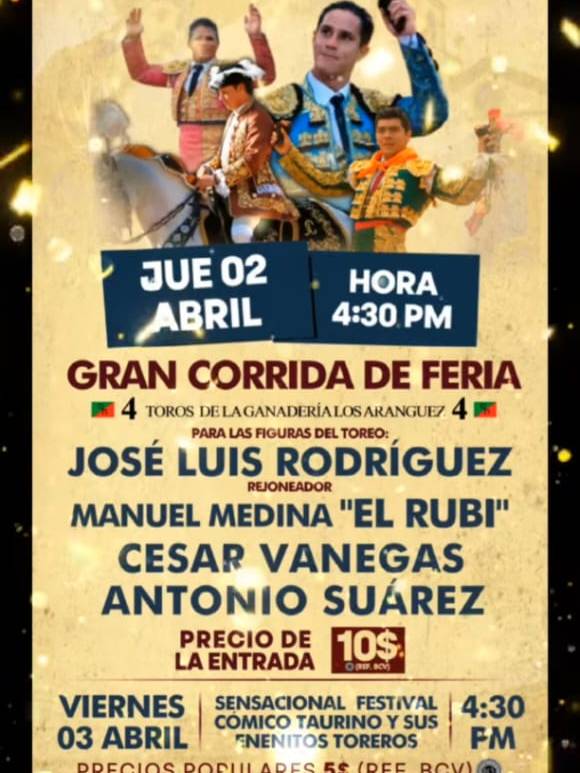 LA PROMESA DEL NAZARENO Y HONOR AL JOROPO PRESENTES _Se dará una corrida de toros con diestros y rejoneador venezolanos_ Por Isrrael Sotillo Barinas, Venezuela, miércoles 18 de marzo de 2026 Achaguas se metió en el calendario taurino de Venezuela y este año 2026 anuncia celebrarlo en grande el próximo jueves 02 de abril con un atractivo Cartel PARA LAS FIGURAS DEL TOREO: JOSÉ LUIS … Continúa leyendo CARTEL PARA LA CORRIDA DE TOROS DE LAS FERIAS POPULARES DE ACHAGUAS