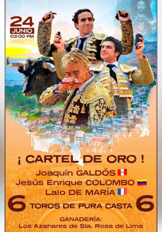 HOY HOY HOY. Cartelazo el de hoy 24 de junio en San Pablo, Cajamarca. Por Isrrael Sotillo Barinas, Venezuela, 24 de junio de 2025 Jesús Enrique Colombo se bate en la arena con el torero peruano Joaquín Galdós y el francés Lalo de María, con motivo de las festividades en honor a San Juan Bautista. Se lidiarán toros de la prestigiosa Ganadería de Los Azahares … Continúa leyendo ¡COLOMBO TOREA EN PERÚ!