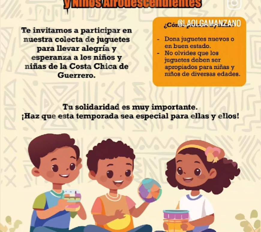 Estamos recolectando juguetes para llevar alegría a los niños y niñas de la Costa Chica de Guerrero. Si tienes juguetes nuevos o en buen estado, nosotros podemos pasar por ellos. Cuenta de una integrante de la asociación: Gloria Stephanie Sánchez _Cuenta BBVA:_Cuenta: 152 870 0033Cuenta CLABE: 012 180015287000331Tarjeta de débito: 4152 3139 5001 4329 En cuanto compremos los juguetes te pasamos el recibo. Fecha límite: … Continúa leyendo ¡Participa en nuestra Colecta de Juguetes para Niñas y Niños Afrodescendientes!