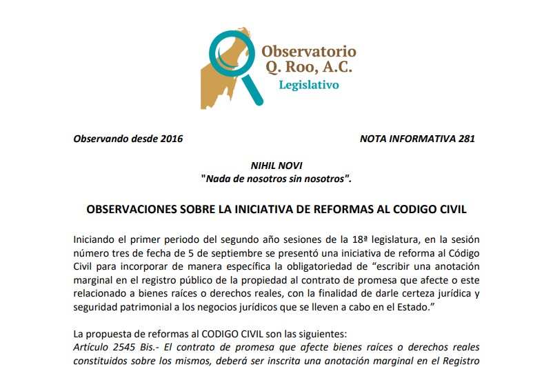 BUSCAN EVITAR FRAUDES INMOBILIARIOS CON “ANOTACIÓN MARGINAL” EN EL REGISTRO PÚBLICO • El Observatorio Legislativo considera que esta iniciativa de reforma debe someterse a Parlamento Abierto.• “Debe haber un plazo máximo para las promesas, porque si no, se pueden quedar ahí eternamente”. Por: Jorge A. Martínez Lugo.Quintana Roo 19 de septiembre del 2025 La iniciativa de reforma al Código Civil del Estado presentada en la … Continúa leyendo “La Última Palabra”