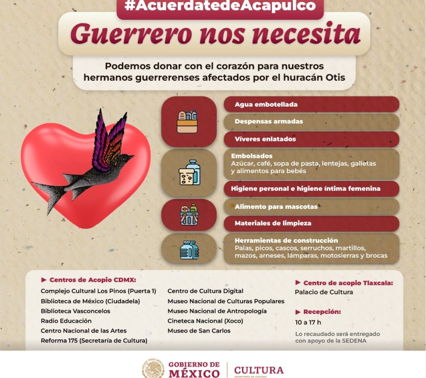 Ciudad de México,26 de octubre del 2023 Se abren otros centros de acopios en la Ciudad de México:Paracutin 222, Roma sur Comuna del Sur, en Morelos y Bucareli, Milenio Tv.Además del Zócalo en el asta bandera, en CU en el Estadio UNAM, en el IPN, canal Once, en la alcaldía de Toluca Edomex, en la alcaldía de Morelia, Michoacán, en la Casa Guerrero Arquímides 72 … Continúa leyendo Se multiplican los centros de acopio para Acapulco