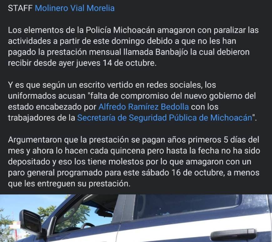Morelia, Michoacán, 15 de octubre del 2021. Los elementos de la Policía michoacana amagaron con paralizar las actividades a partir de este domingo debido a que no les han pagado la prestación mensual llamada Banbajío, la cual debieron recibir desde ayer jueves 14 de octubre. Y es que, según un escrito vertido en redes sociales, los uniformados acusan «falta de compromiso del nuevo gobierno del … Continúa leyendo Elementos de la Policía Michoacán pararán actividades el sábado 16 por falta de pago de prestación