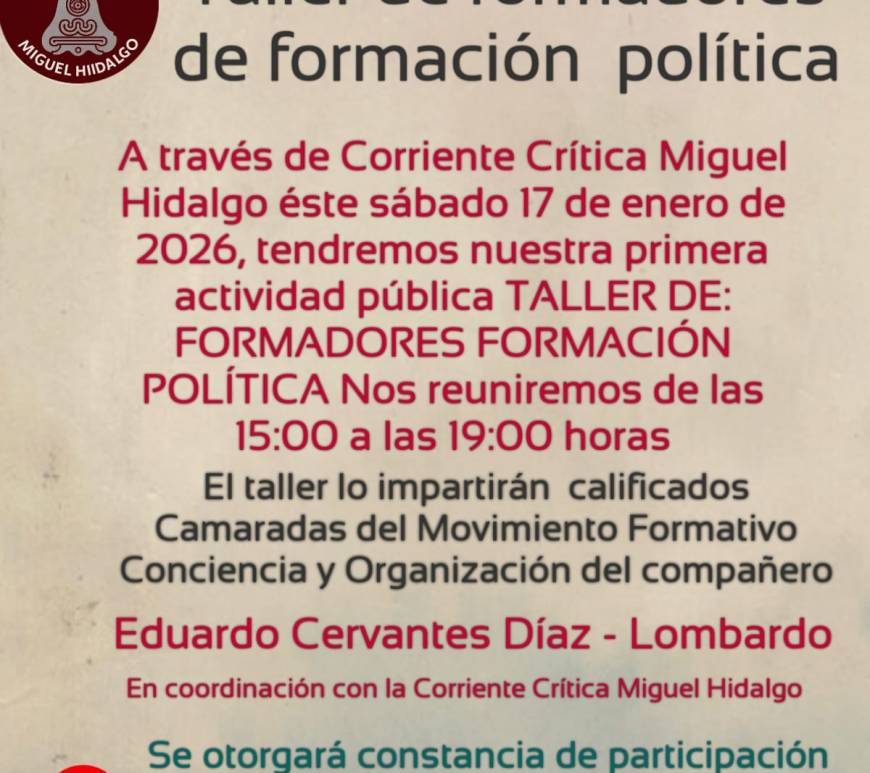 Redacción Fotografía cortesía. Este sábado 17 de enero 2026, tendremos nuestra primera actividad pública. TALLER PARA FORMADORES DE FORMACION POLÍTICA Nos reuniremos de las 15:00 a las 19:00 horas (3 a 7 de la tarde) en nuestras instalaciones de Golfo de San Matías número 3 colonia Tacuba El taller nos lo impartirán calificados camaradas del Movimiento Formativo Conciencia y Organización del Compañero Eduardo Cervantes Diaz-Lombardo … Continúa leyendo CORRIENTE CRÍTICA MIGUEL HIDALGO 2026