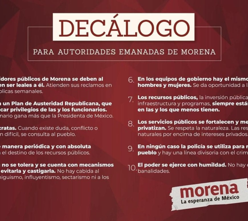 DÉCALOGO DE MORENA: 8: Repudio a la privatización de los servicios públicos.• ¿Cómo le van hacer los verdes? El decálogo ¿exceptúa colores?• La oposición surgirá del interior: Luisa María. Por: Jorge A. Martínez Lugo.Quintana Roo, 23 de octubre 2024 Precisamente el día del descubrimiento y conquista mexica, 12 de octubre, Morena instala el decálogo en Quintana Roo y va en procesión por todos los estados … Continúa leyendo “La Última Palabra”