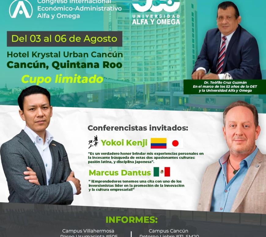 Héctor Cobá La institución impulsa el emprendedurismo; Marcus Dantus y Yokoi Kenji serán los expositores estelares La Universidad Alfa y Omega anunció la realización del Primer Congreso Internacional Económico-Administrativo Alfa y Omega para impulsar la educación integral y el emprendedurismo entre los estudiantes de universitarios y en la población. Los expositores estelares serán Marcus Dantus y Yokoi Kenji, del 3 al 6 de agosto en … Continúa leyendo Anuncia Universidad Alfa y Omega Primer Congreso Internacional Económico-Administrativo, en Cancún