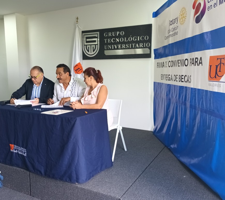 Héctor Cobá Parte de las becas serán para elementos del sector de la policía municipal en Benito Juárez Directivos del Grupo Tecnológico Universitario y el Club Rotario Conmemorativo de Cancún realizaron la firma de convenio para la entrega de becas de bachillerato, licenciatura, maestría o doctorado para personas con estudios inconclusos.El convenio firmado hoy es muy importante para nosotros, siempre lo hemos dicho: ayudar a … Continúa leyendo Tecnológico Universitario Cancún dona 200 becas para estudios al Club Rotario